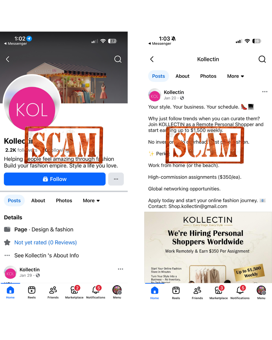 We’ve recently been made aware of fraudulent messages from individuals falsely claiming to represent Kollectin. These impersonators are contacting people via Facebook Messenger and other platforms, offering remote “assignments” and requesting payment through gift cards or Cash App.