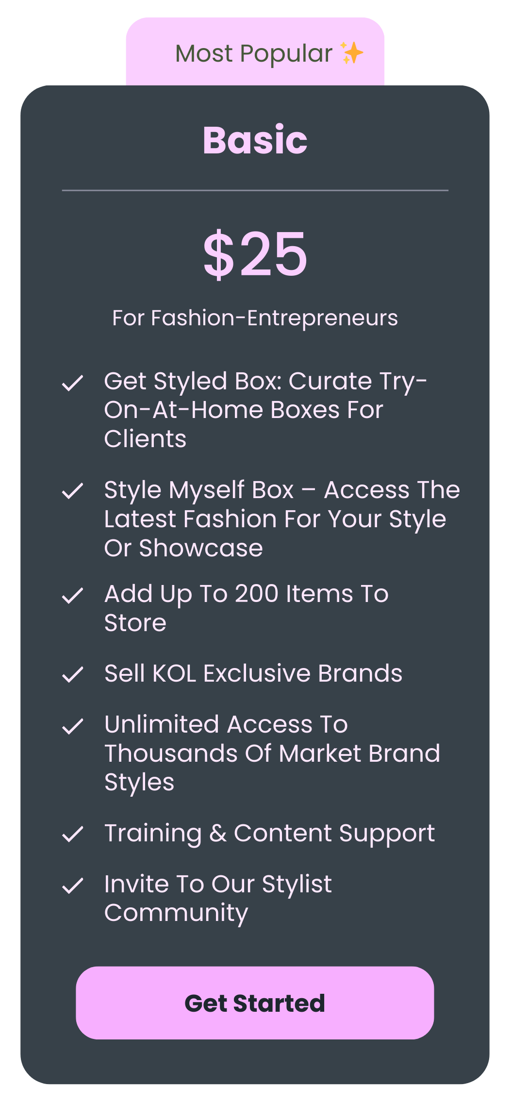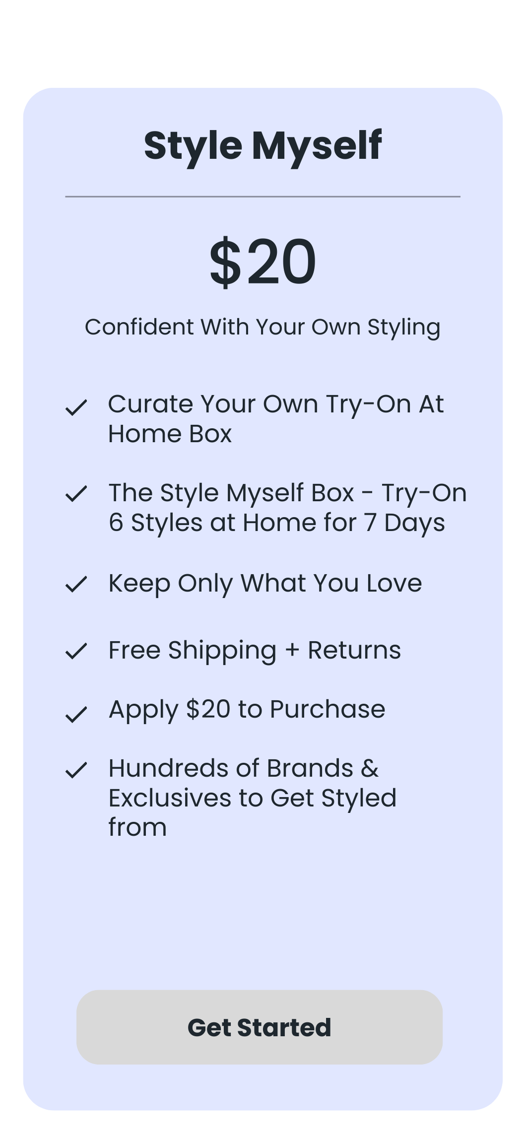 The Get Styled Plan allows the Stylist who referred you to help curate a try-on-at-home box with 6 styles. You'll have 7 days to try on the items before deciding which ones you want to keep